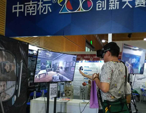 “中南標”展位上,游客體驗VR虛擬現實技術裝飾設計方面的應用
