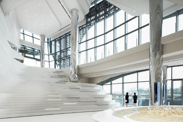 這個采光充足的大型中庭將所有主要功能連接在一起,用作接待和展覽廳。較低的樓層提供休閑和健康設施,包括室內游泳池、健身房和兒童游樂區。所有的空間都直接連接到外部露臺,提供人以廣闊的視野和精心設計的景觀。主樓的外觀設計采用了獨特的形式和材料。