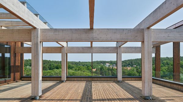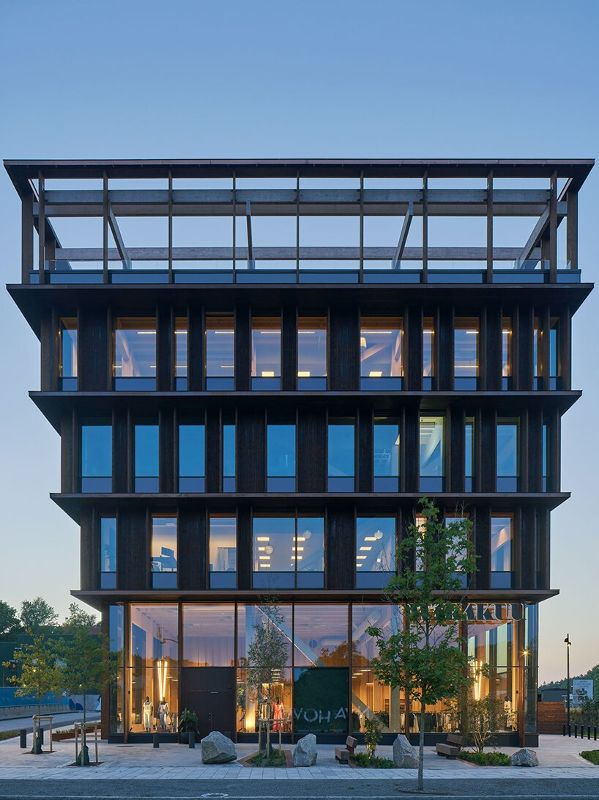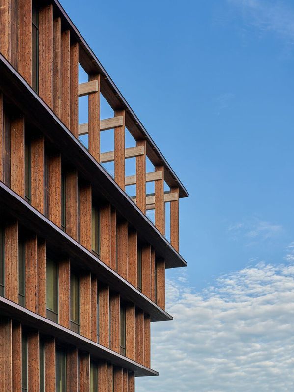 瑞典的白建筑事務所,在瑞典的Gothenburg建造了“樞紐”,這是一座五層的辦公大樓,外表皮是木制框架。五層交錯遞增的建筑揭示了木材在現代建筑中的可能性,滿足了當今的需求。從地板到天花板的玻璃窗框住了木質骨架,使其醒目的入口層暴露出來,邀請路人窺視。