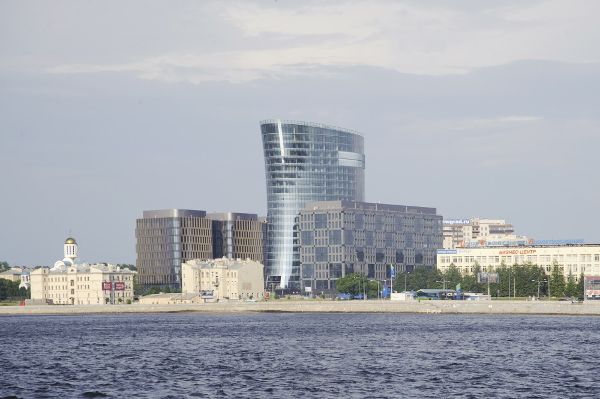 圣彼得堡銀行金融集團的行政總部坐落在涅瓦河和奧克塔河交匯處的河畔,它是奧克塔新綜合建筑開發的一部分。涅瓦河畔的一組典型新樓盤正在努力與南側和北側的原有建筑和諧相處。建筑高22層,它的新立面處在綜合建筑群的主軸線上。圣彼得堡銀行是建筑群的中心建筑,兩側是兩座9層高的翼樓。這三座建筑坐落在同一個基座上,不同的體量就此被統一在一起。基座的兩層地下停車場為該中心提供了充足的停車位。跨越堤壩的人行天橋最終使設計的重點放在河岸與塔樓之間的新軸線上。帶水上觀景平臺和餐廳的游船碼頭最終將行政大樓與城市的主要干線連接起來。這項規劃是同圣彼得堡的葉夫根尼?格拉西莫夫及其合伙人公司(EGP)合作來進行管理的。