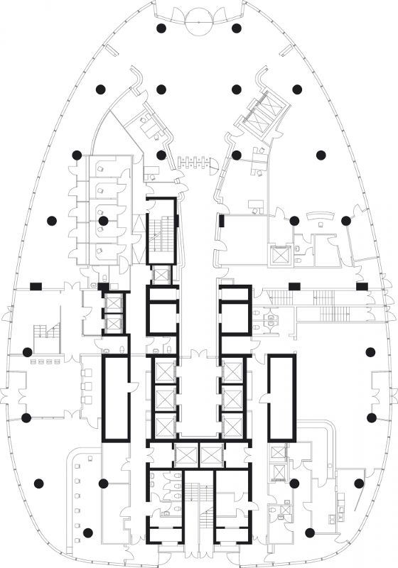 一層部分的立面用天然石材覆蓋,為游客和路人提供熟悉的環境,并營造一種安全可靠和高品質的感覺。翼樓的設計各有特色,其特點是以各種方式呈現在人們眼前的垂直構件和水平構件。北側的建筑由三個相同的體量構成,樓層平面呈凸曲線,轉角帶有一定的弧度,極具表現力。南側的翼樓是由玻璃、亞光和高光的暗色石材表面構成的具有古典建筑風格的立方體結構。塔樓以它的高度和獨特的輪廓與兩座翼樓區分開來。面向河畔一側的玻璃立面在整個長度上向內彎曲。由此而形成的腰節給建筑額外增加了微妙的動感。因此從河對面看,無論哪個角度,建筑都非常優雅。未來,跨越堤壩的水上人行天橋將成為與河岸垂直的主軸線。人行天橋延伸到水上觀景平臺和餐廳,并將后退式設計的行政大樓與涅瓦河聯系起來。