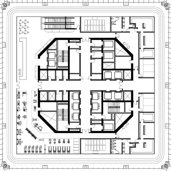 對(duì)角線大樓高達(dá)343米,能產(chǎn)生極大的視覺刺激效果。對(duì)角線形的巨大框架有點(diǎn)類似于諾曼?福斯特在紐約設(shè)計(jì)的赫斯特大廈,與傳統(tǒng)框架結(jié)構(gòu)建筑相比,能減少超過25%的所需鋼框架總量。此外,這種非線性的垂直表面還緩解了風(fēng)荷載和漩渦。主要結(jié)構(gòu)支撐為建筑角落的四根墩柱,這樣也打開了室內(nèi)大堂與中庭。