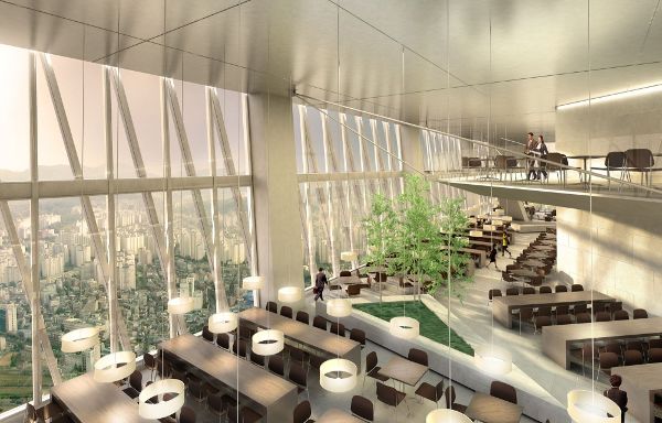 在建筑內(nèi)部和立面上采用的被動(dòng)環(huán)境控制策略包括根據(jù)方位而設(shè)置的遮陽篷,水平、垂直和對(duì)角,各種方向架設(shè),因而能減少夏天的熱增量,在冬季則利于陽光直射。這棟摩天大樓的獨(dú)特幕墻采用三層玻璃窗取代了大多數(shù)高樓中的標(biāo)準(zhǔn)雙層玻璃。決定選用這種類型的玻璃窗的關(guān)鍵在于SOM的設(shè)計(jì)目標(biāo),即滿足首爾綠色指南標(biāo)準(zhǔn)的要求。建筑在內(nèi)部集成安裝了冷梁系統(tǒng),取代空氣成為導(dǎo)熱介質(zhì),熱活性液體循環(huán)加熱冷卻系統(tǒng)就能通過冷梁來供暖與制冷。這種系統(tǒng)在效率與居住者舒適度方面均超越了傳統(tǒng)的氣動(dòng)系統(tǒng)。