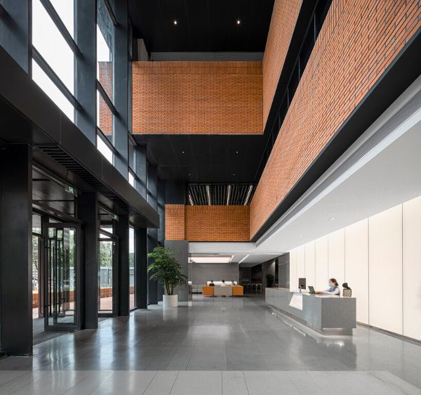 屋頂花園為立面設計策略提供了參考,因為URBANUS希望將底層大廳與屋頂連接起來。選擇紅磚幕墻系統是為了與清華大學的材質相聯系,清華大學位于城府路的北部。磚塊創造了一個均勻的立面處理,而玻璃元素和穿孔則增加了透明度和節奏感。