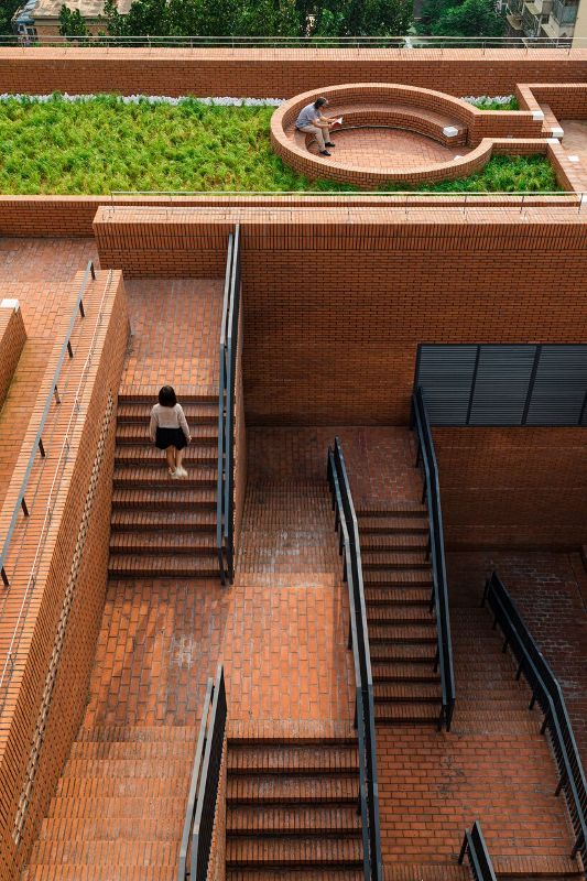 在評估現有建筑時,URBANUS發現主要問題之一是附近缺乏公共設施。建筑師的解決方案是將屋頂打造成一個可使用的露臺,供辦公室員工在工作之余進行社交或放松。URBANUS談到屋頂花園背后的想法時說:“所有的設計努力都是為了使這棟建筑成為年輕專業人士的生產空間。作為一個療養空間,屋頂花園全部用磚塊渲染,與外墻保持一致。中國工人應該有一個更好的工作場所”。