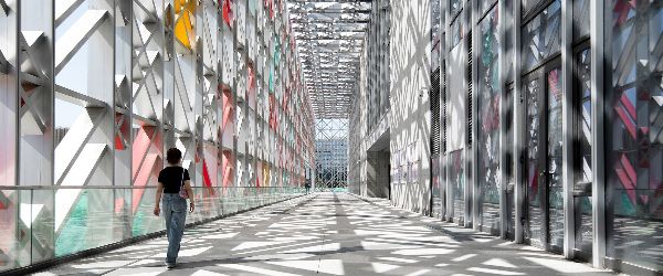 ZXD建筑事務所的格子外墻包裹著五棵松冰上運動中心,呈現出如冰裂一般的視覺效果,同時引入了復雜、有層次的空間體驗。重復的模式是為了掩蓋這個街區的體量,并使建筑的輪廓更加輕盈和隱蔽。網格墻和主立面之間有一條名為冬奧會的走廊,成為一個具有儀式感和紀念意義的空間。當自然陽光穿過建筑時,光和影的圖案效果就會投射到地面和外墻。