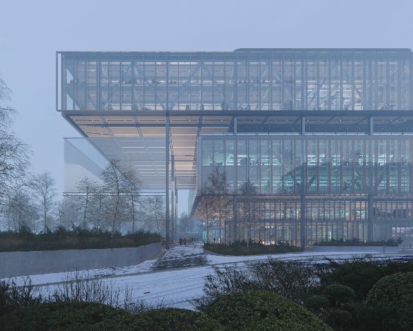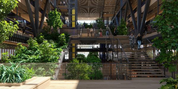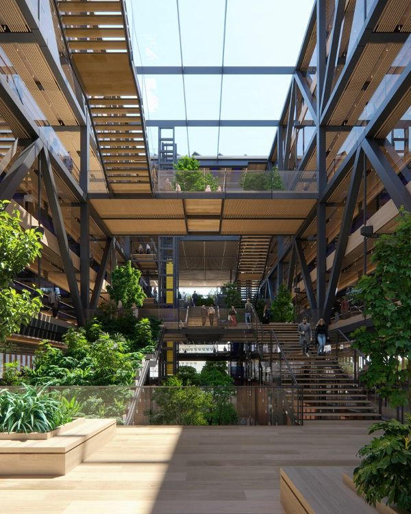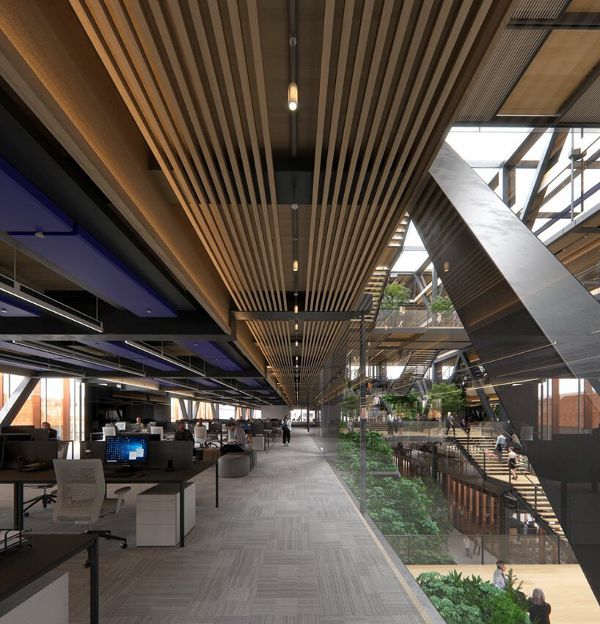 一系列的平臺和種植的平臺漂浮于空中,并由一系列規模宏大的臺階連接。創造了一個中央場所,它既是聚會、問候的場所,也是運動的場所。上面是一個全玻璃的中庭屋頂,結合了自動自然通風和太陽能控制系統,使日光進入建筑的中心,同時確保舒適的室內環境。