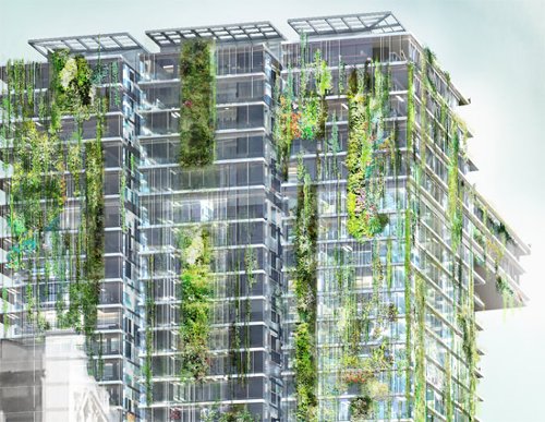 在該項目中,努維爾與法國藝術家,植物學家Patrick Blanc合作,完成了塔樓立面上眾多豎向花園的設計工作. 花園空間與平臺的豎向連接部分的植物將塔樓包裹了起來,從而將新區域中心的中央花園延伸到這個綠色建筑中.