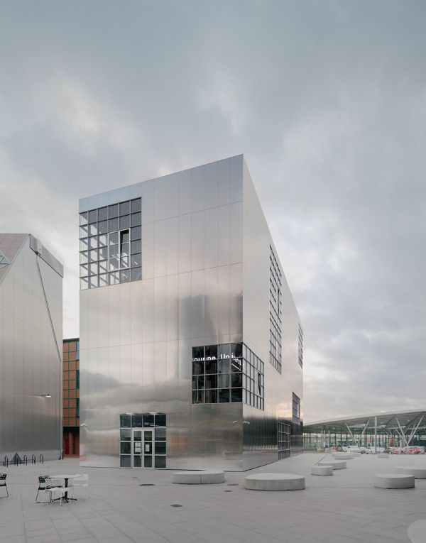 巴羅茲-維加在設計區的兩座建筑與藝術家工作室的想象相呼應。這兩座建筑的設計都考慮到了攝影師、藝術家和雕塑家,強調在一個由大窗戶、雙層高的房間、外部樓梯和原始材料定義的工作空間中對光線的利用。位于入口處的A1是第一個體量,作為大學建筑。憑借其拋光的鋁制外觀,該建筑吸引了來自遠近的游客。外墻的光線反射在一天中不斷變化,使其在每個季節都顯得不同,并使其照亮周圍的庭院和小巷。同時,D4是NOW畫廊的所在地,位于場地的中央廣場,具有一個細長的黑色外墻。