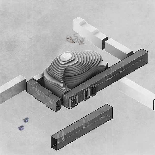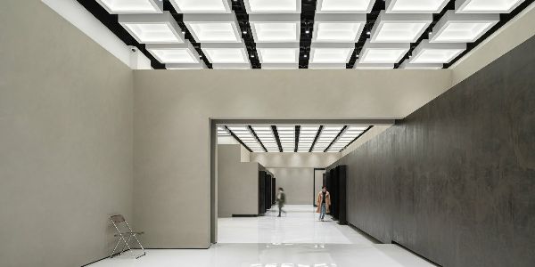 在中央蟲洞的兩端,該空間設有畫廊空間,以滿足靈活的功能需求。與蟲洞不同的是,畫廊充當了熟悉的錨點。出現在天花板上的網格象征著共享意識。畫廊的墻壁是手工抹灰的,而地板是由拋光的環氧樹脂制成。西側畫廊的旋轉隔板被用來配置空間劃分,根據節目的需要和場合來創造變化的邊界。此外,旋轉隔斷還配備了電源插座和一個隱藏的進水口,在活動期間可作為酒吧或咖啡座使用。畫廊空間可以通過隱藏在口袋墻中的自動玻璃隔斷進行細分。袖珍墻被建成了半墻,因此,允許閣樓的天花板延伸到外面。