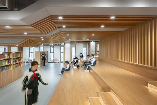校園也被清晰地劃分為兩個區域。第一個是用于文化和體育活動的三層架空建筑群;它包括體育館、演講廳、防風操場、廣闊的體育館和食堂。第二個區域主要包括教學區和學校圖書館。面對東面和北面的城市公園,兩層的架空走廊為學生提供了迷人的視野。CMAD建筑師總結說:“校園空間和城市公園之間的互動,結合沿街的外墻,創造了一個舒適而和諧的城市界面”。