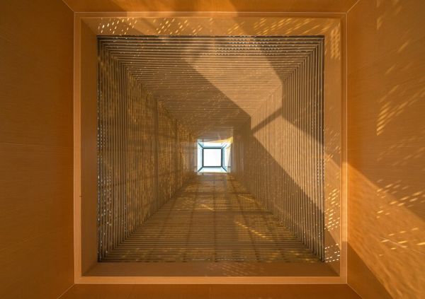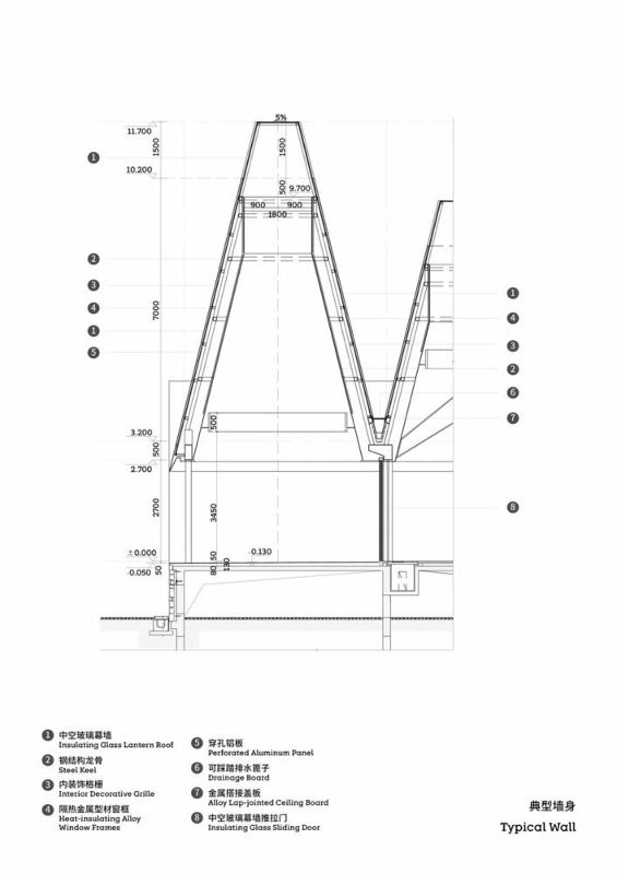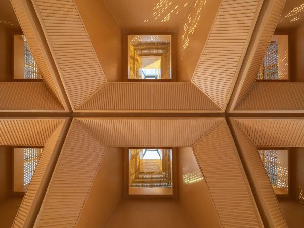 天蓬的整體高度低于12米,而每個金字塔形的模塊頂部都有一個天窗,讓自然光進入室內。屋頂系統由三層組成:首先,定制的穿孔鋁板作為外層,紋理如同水杉樹的分層樹冠,玻璃作為中間層,引入更大的光照度,烤木板覆蓋內層。