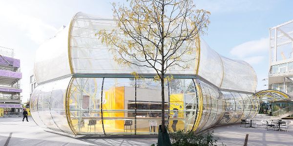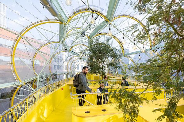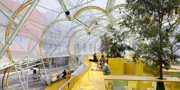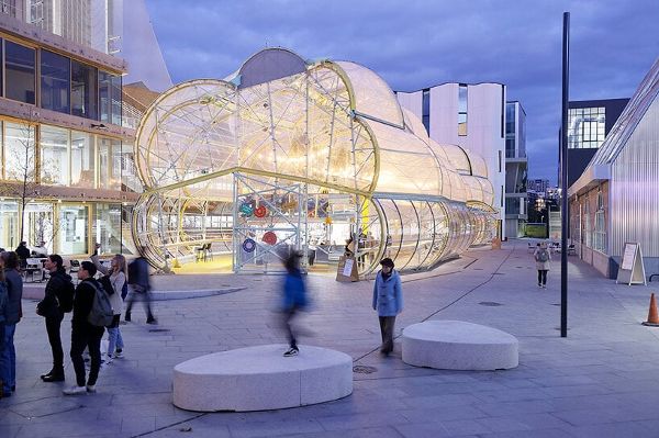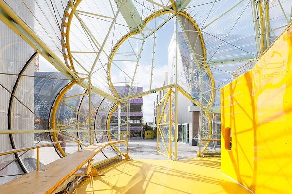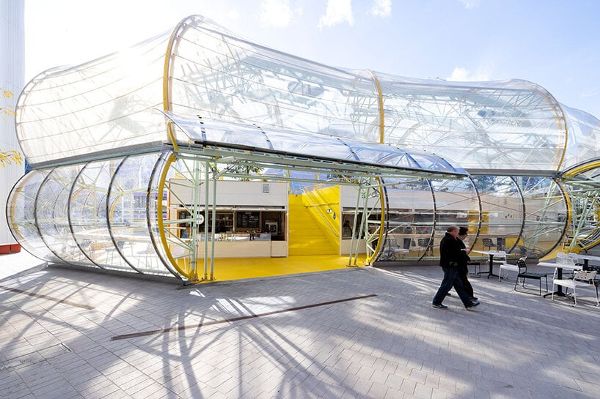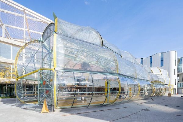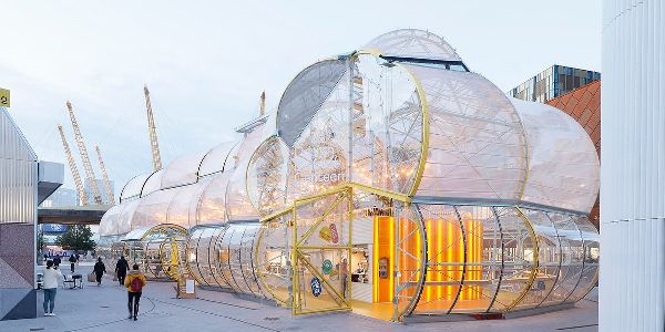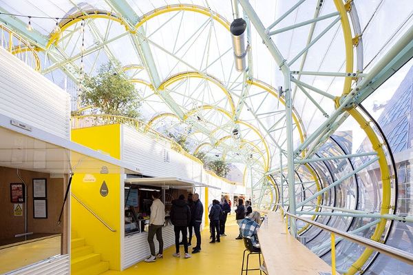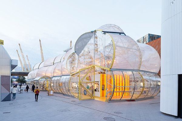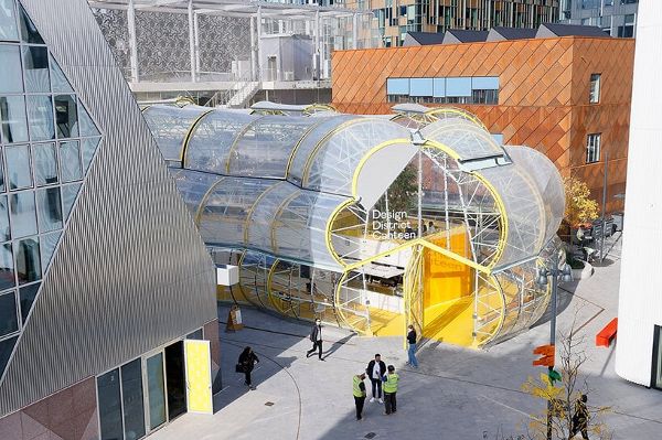 塞爾加斯卡諾設(shè)計(jì)的新建筑,位于倫敦的設(shè)計(jì)區(qū)(裝逼區(qū))的食堂,它采用透明的結(jié)構(gòu),位于格林威治半島的主要行人通道上,讓當(dāng)?shù)厝撕陀慰瓦M(jìn)入其充滿光亮的圓頂狀內(nèi)部,并以充滿活力的黃色為主色調(diào)。設(shè)計(jì)區(qū)食堂由輕金屬結(jié)構(gòu)、透明ETFE膜外殼和聚碳酸酯板組成。建筑形體像脊柱,其中有多個(gè)攤位和頂層的座位區(qū)。