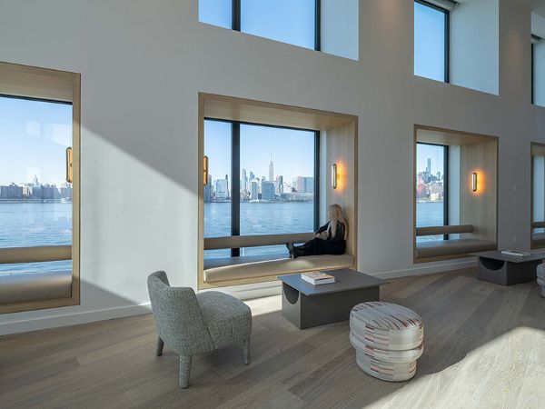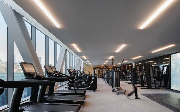 42,000平方英尺的設施分布在建筑群的中心,形成循環。兩層的室外露臺模仿了塔樓的變化形式,有角度地切入庭院,并向海濱開放。在它們的上方,能俯瞰曼哈頓天際線的便利設施橋將兩座塔樓連接起來。