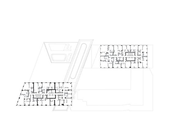 階梯將塔樓分為七至八層,與鄰近建筑的規模相呼應。外立面加強了這種細分,借用了綠點聯排別墅常見的瓦片覆蓋層的語言。預制混凝土板的網格由有角度的平面雕刻而成,每個街區的方向交替進行,形成動態的浮雕效果,對太陽的運動做出反應。