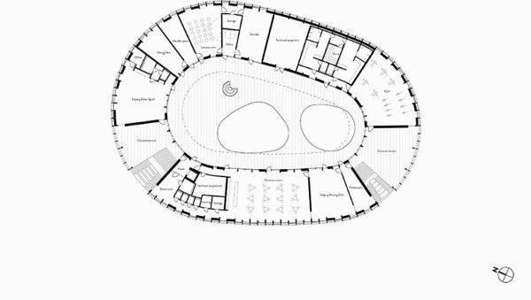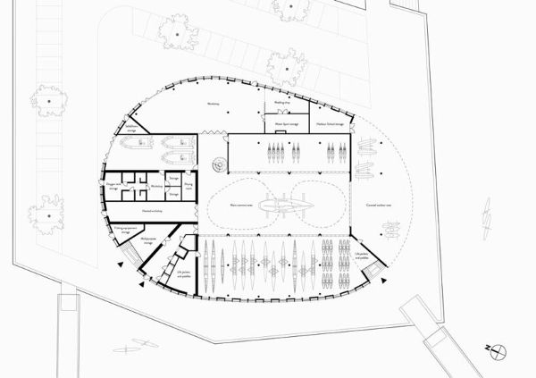 該設施的下層通過一座橋與大海直接相連,承載著船只的存儲和車間空間。上層容納了各種機構,如賽艇、皮劃艇、帆船、潛水和鐵人三項俱樂部,以及公共區域、教育中心和培訓設施。不同尺寸的開口穿透了外墻,讓豐富的日光灑在室內。當太陽落山時,溫暖的光芒使該中心充滿活力,從遠處看就像一座漂浮的燈塔。