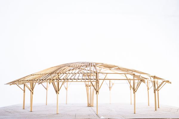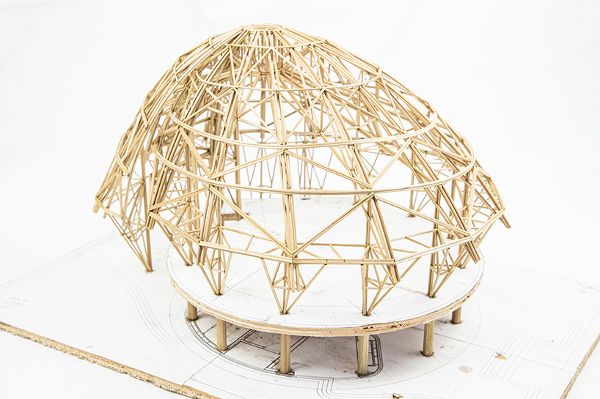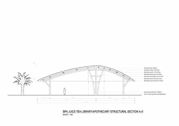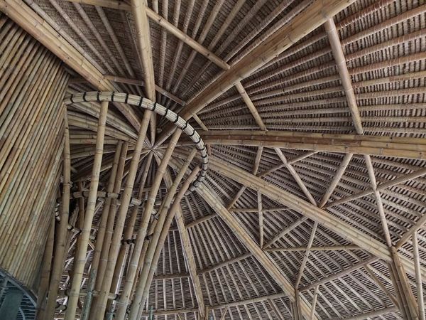 建筑群遵循由十四根柱子組成的計(jì)劃,這些柱子由耦合的桿子制成,并用傾斜的支撐物加固,在中央竹塔的幫助下減輕屋頂?shù)闹亓俊?屋頂結(jié)構(gòu)由十四根由三根桿組成的梁組成,徑向放置在垂直支架上。 五階線性檁條形成屋頂?shù)膱A形形狀,并為最后一層椽子提供支撐。 竹子交叉系統(tǒng)加固了結(jié)構(gòu),而懸掛在排水溝線上的天然印度尼西亞茅草“alang-alang”提供了遮陽(yáng)避雨的保護(hù),并形成了天篷的最終外觀。