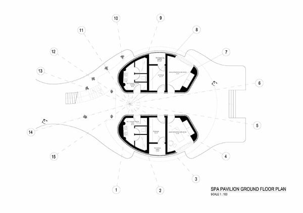 高架人行道通向水療館,該水療館在地面和服務(wù)空間安排了兩層樓的水療休閑功能,以及在上層的多功能廳。 長(zhǎng)長(zhǎng)的傾斜柱子形成了建筑物的入口,竹子覆層覆蓋了混凝土結(jié)構(gòu),始終保持著自然的外觀。 屋頂支撐系統(tǒng)由傾斜的竹柱制成,位于混凝土板上。 一樓規(guī)劃了一個(gè)圓形開(kāi)放區(qū)域,在板的周邊組裝了必要的支撐元件。 屋頂懸垂保護(hù)竹結(jié)構(gòu)免受陽(yáng)光和雨水的影響,同時(shí)構(gòu)成海景。 “alang-alang”茅草網(wǎng)制造了一個(gè)復(fù)雜的紋理,在山頂點(diǎn)形成了一個(gè)天窗,固體透明的抗紫外線聚碳酸酯可以為空間提供天頂照明。