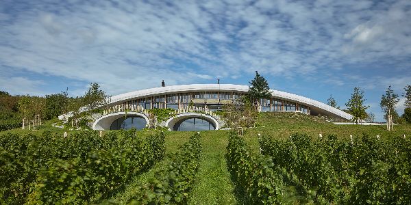 周圍地區被各種灌木和成熟的樹木精心點綴,有助于創造一個最佳的微氣候。酒廠戰略性地位于葡萄園之中,最大限度地減少了對原材料和工人的運輸需求。生產區巧妙地位于地下,而客戶區則通過玻璃幕墻擁抱自然陽光,利用被動能源來減少能源消耗。為了防止在炎熱的夏季出現過熱現象,該酒廠采用了隔熱的三層玻璃,結合木質橡木板條、充足的屋頂懸垂和帶防水布的涼棚遮陽。這些措施確保了最佳的溫度調節,同時保持了一個舒適的室內環境。雨水被收集在一個儲水池中,用于灌溉葡萄園。