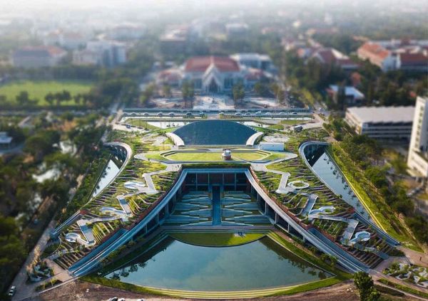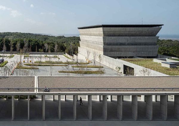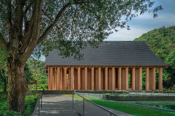 部分“地面感受”側(cè)重于將環(huán)境作為設(shè)計解決方案,將材料、工藝和構(gòu)造融為一體,創(chuàng)造出多維空間感。例如,Arsomsilp社區(qū)與環(huán)境建筑師事務所設(shè)計的Puey Ungphakorn百年紀念大廳(2019年)和Tha Chalom天空之舟圖書館(2022年),它們形成了和諧的微生態(tài)系統(tǒng),激活了原有的環(huán)境界面。Ambi工作室的湖山水庫考古展覽館(2023年)和毓秀美術(shù)館(2015年)順應地形,通過精心打造的空間為游客提供獨特的觀賞體驗。
