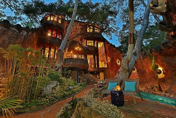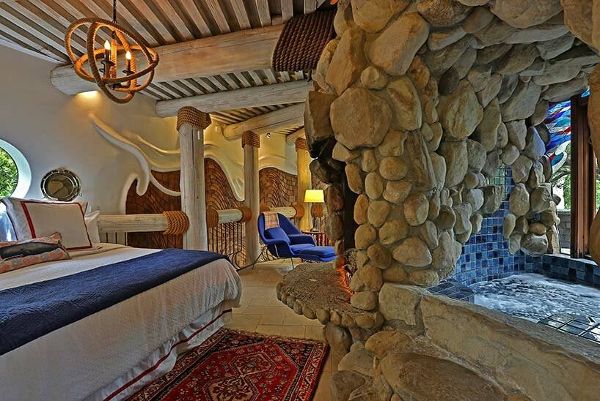 透過270扇比利時鉛制彩色玻璃窗可欣賞到樹木繁茂的景色,而起伏的墻壁則采用威尼斯灰泥裝飾。其他值得注意的元素包括室內竹庭院、室外淋浴和流入鯨尾洞穴的 75 英尺長的游泳池。
